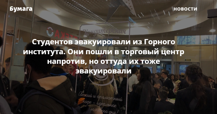 Один из очевидцев рассказал «Бумаге» об эвакуации в Горном университета. По его словам, большинство студентов пошли в расположенный неподалеку ТЦ «Шкиперский Молл». Однако, когда они туда пришли, в торговом центре тоже сработала пожарная сигнализация и всех вывели на улицу.