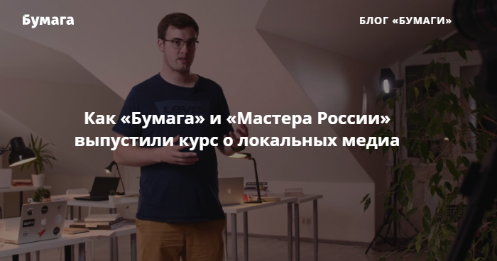 — Главная ценность «Бумаги» — локальный патриотизм. Мы живем в Петербурге, любим свой дом и хотим сделать его лучше. К счастью, в России есть немало других похожих медиа: это и крупные редакции, и небольшие блоги в регионах. Они пишут о самых разных «лучших городах на Земле» и это здорово. Именно локальные медиа в регионах говорят о том, что действительно важно людям, о том, что происходит совсем рядом. Кроме того, местные издания и блогеры, как правило, умеют общаться с аудиторией на равных и организовывать сообщества в офлайне, чтобы решать реальные проблемы (ну или просто делать жизнь приятнее). Если после нашего курса в России станет хотя бы на одно локальное медиа больше, мы будем счастливы.