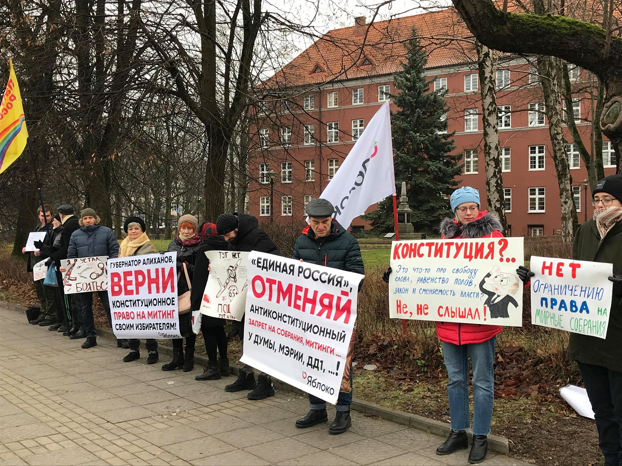 Как рассказал заместитель главы калининградского отделения партии "Яблоко" Виктор Горбунов, власти не согласовывали пикеты у правительства с 2012 года, когда был принят региональный закон о публичных мероприятиях, запрещающий протестовать у органов власти. При этом мэрия ссылалась не на него, а на то, что протестующие мешают людям на тротуаре.
