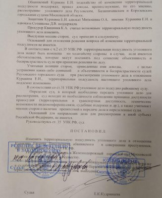 Адвокат Куракина Дмитрий Сотников уверен: преступление, которое вменяют Куракину, считается оконченным на территории Замоскворецкого района Москвы. Поэтому он просил передать дело для рассмотрения в Замоскворецкий районный суд по подсудности. Прокурор не согласился с адвокатом и просил изменить подсудность на «какой-нибудь» суд в Московской области.
