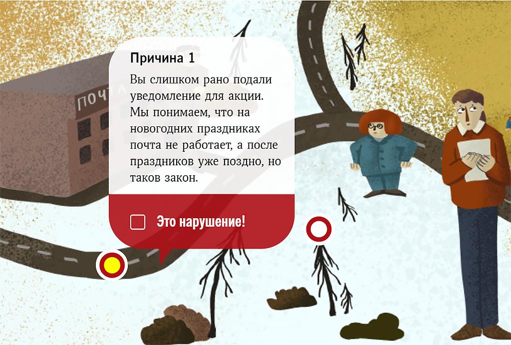 Правозащитная организация Amnesty International совместно с Центром дистанционного обучения HUMANA запустила интерактивную онлайн-платформу «Правозащитный воркаут». Это первый тренажер по правам человека, созданный на основе реальных дел. Пользователи могут прогуляться по виртуальному городу, попытаться подать уведомление на проведение своей акции и разобраться в различных причинах отказов. После этого можно будет пообщаться с чиновником-ботом и выбрать свой сценарий действий в случае отказа.