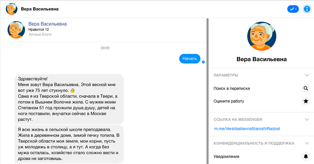 Convergent Media Group для фонда «Старость в радость» создал «душевного чат-бота». Он говорит от имени 75-летней пенсионерки Веры Васильевны, проживающей в Тверской области, которая на простом и понятном языке рассказывает обо всех направлениях работы фонда и о своей жизни в доме престарелых.
