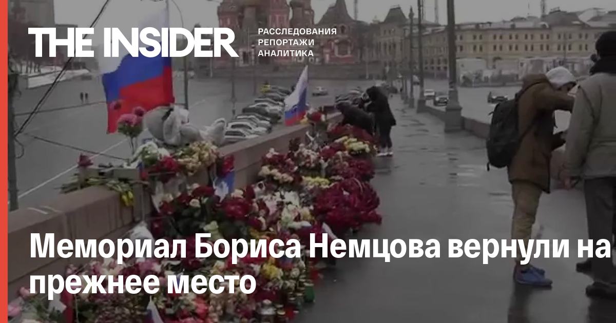 После реконструкции Большого Москворецкого моста мемориал Бориса Немцова перенесли на прежнее место. Об этом сообщил сопредседатель московского отделения партии ПАРНАС Михаил Шнейдер.