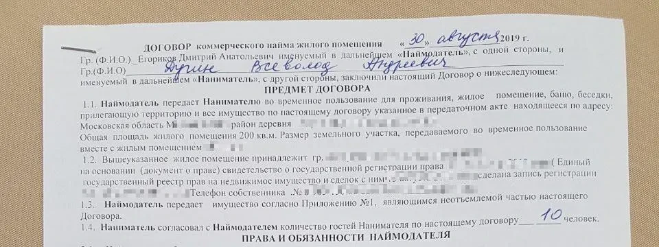 Подтвердить эту информацию у риэлтора мы не смогли, он предпочел не обсуждать нюансы своей коммерции. Но, судя по «финансовым документам», кроме 40 тысяч рублей за сутки аренды с арендатора был взыскан и 20-тысячный депозит, предусмотренный на случай порчи имущества арендодателя.