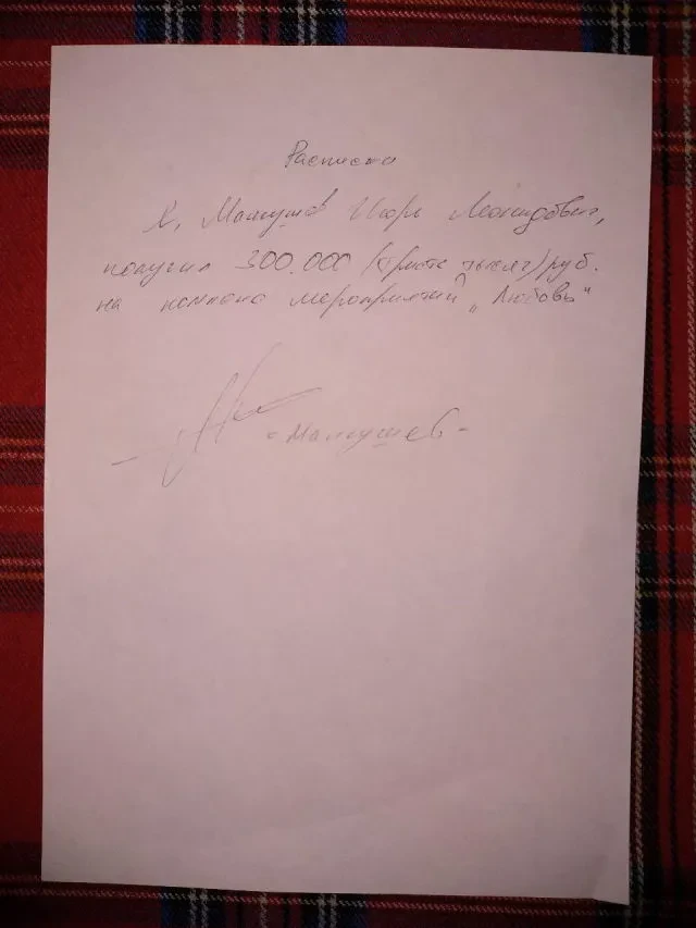 Расписка Игоря Мангушева в получении 300 тысяч рублей на «комплекс мероприятий "Любовь"»