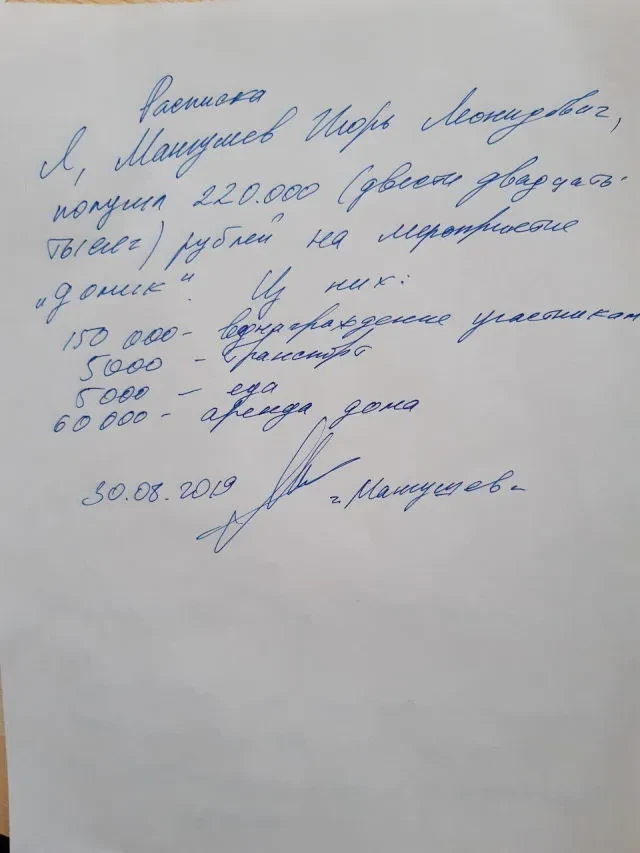 Расписка Мангушева в получении 220 тысяч рублей на мероприятие «Домик»