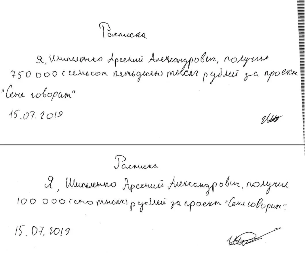 Судя по распискам, услуги социолога Шипеленко стоили 850 тысяч рублей