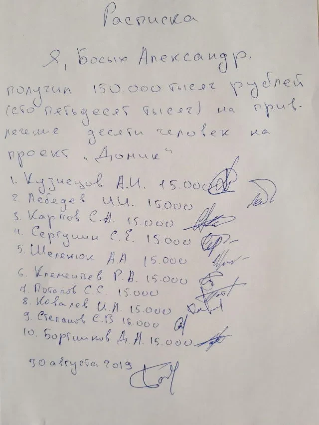 Кто занимался их привлечением, ясно из другой расписки — некий Александр Босых 30 августа 2019 года своей подписью подтверждает, что привлек в проект десять человек, в том же рукописном документе — фамилии и подписи в получении денег.
