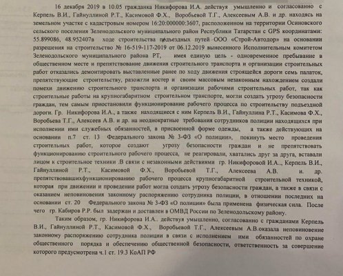 Ирина Никифорова добавила, что на всех задержанных составили почти одинаковые протоколы. По мнению силовиков, лагерь активистов создал помехи свободному передвижения строительной техники и организации строительных работ. При этом участники лагеря якобы не выполнили требования полицейских и не прекратили препятствовать строительным работам.