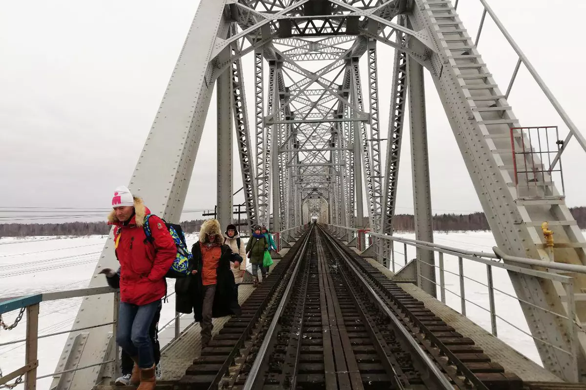 Мост выглядит устрашающе – по центру, между рельс, он проложен деревянными мостками, по краям, в местах для пешеходов, натянута железная сетка. Зимой попасть из Межега в Мадмас проще по льду. Но в этом году, по словам Виктора, выпало много осадков, река переполнилась, и лед на ней все никак не может встать.