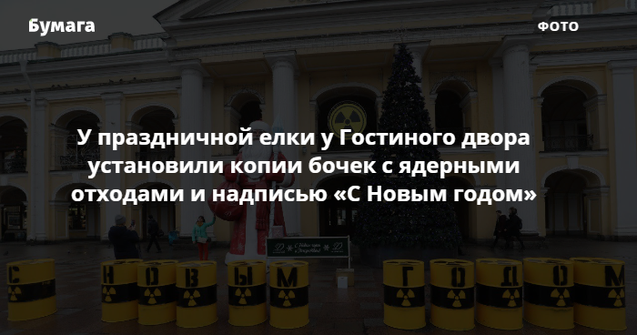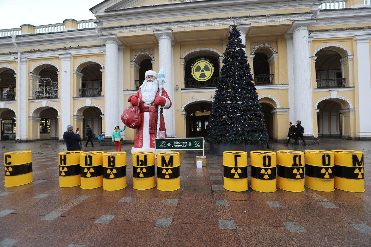 Рядом с праздничной елкой у Гостиного двора в Петербурге активисты Greenpeace провели акцию, на которой разместили копии желтых бочек с ядерными отходами с надписью «С Новым годом».
