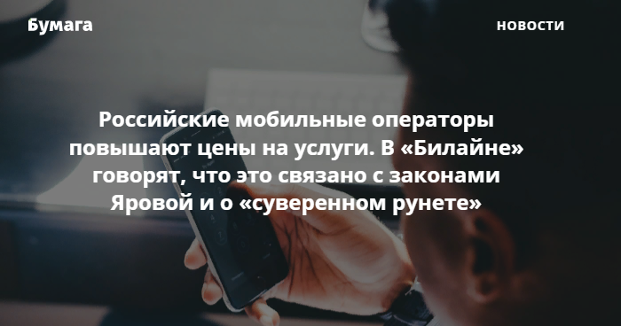 Причины повышения цен на услуги раскрывает только «Вымпелком». Как изданию пояснила представительница компании, это связано с изменением рыночной ситуации, на которую повлияли затраты на «закон Яровой» и планируемые расходы на реализацию закона о «суверенном рунете».