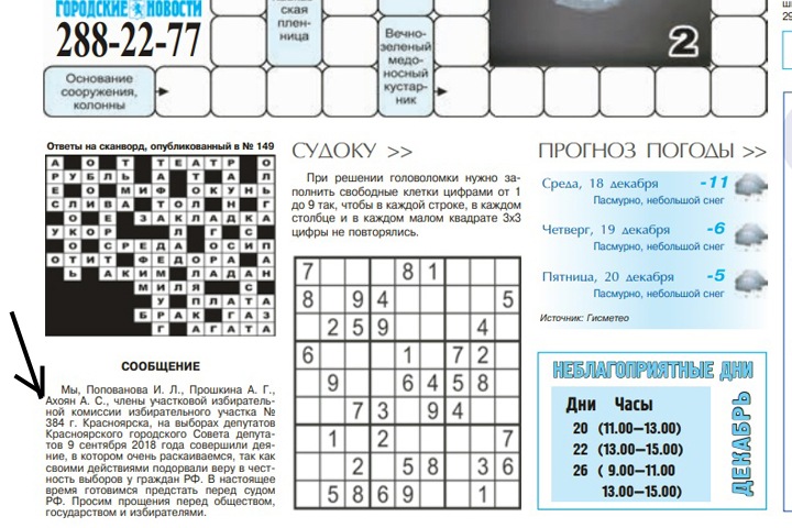 Обвиняемые в фальсификация на выборах горсовета Красноярска опубликовали извинения перед жителями. Заявление размещено на последней полосе выпуска муниципальной газеты «Красноярские новости» от 17 декабря, прямо под сканвордом (издание имеется в распоряжении Тайги.инфо).