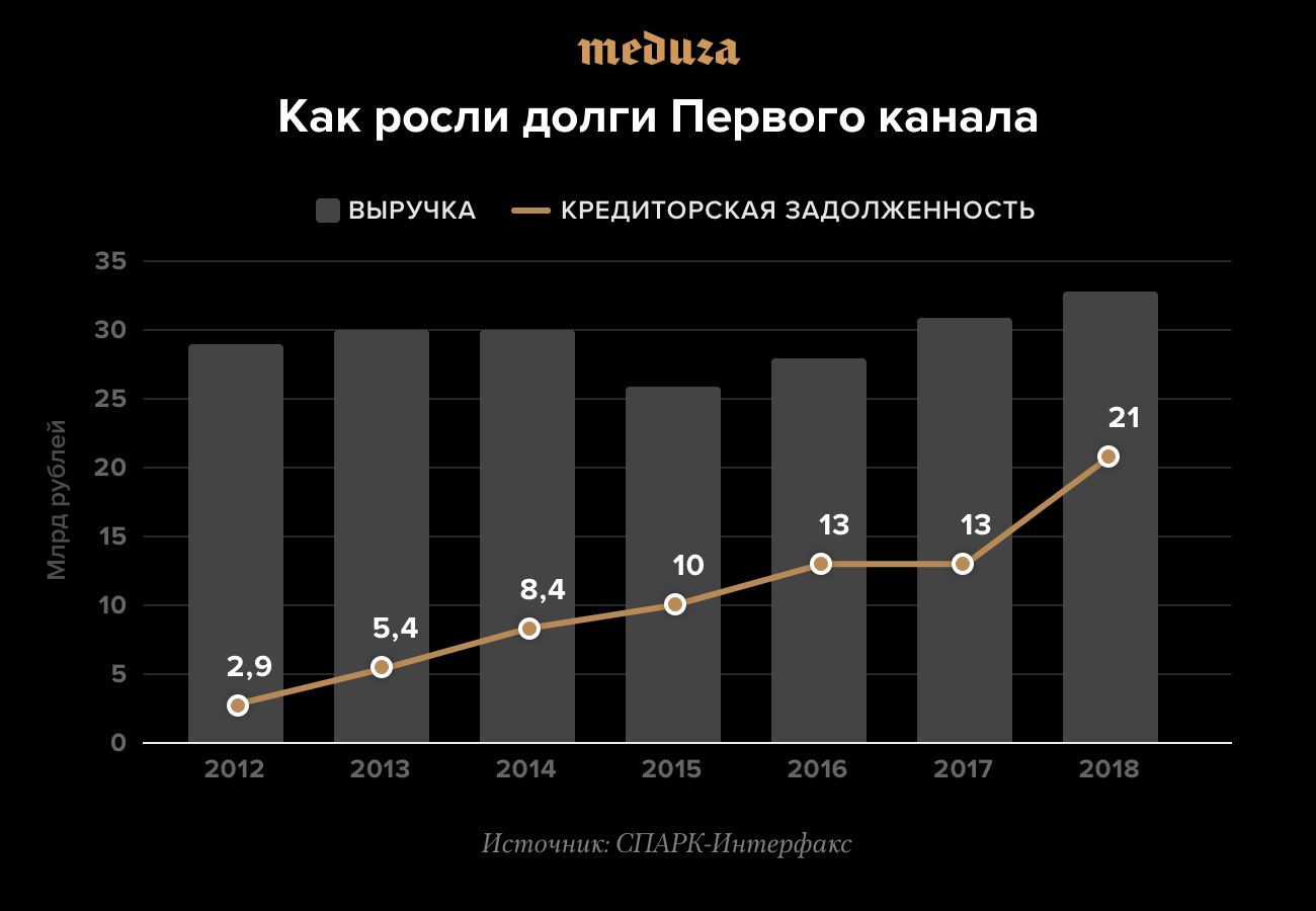Первому перестало хватать денег одновременно на премьерные сериалы, масштабные шоу и ежедневные новости. С 2014 года канал начал накапливать долги перед подрядчиками: каждый год кредиторская задолженность росла. В 2018 году она превысила 20 миллиардов рублей, выручка за тот же год составила 32,8 миллиарда. За 11 месяцев 2019 года канал получил от рекламы 20 миллиардов рублей выручки, подсчитали в ECI Media Managment. Сам Первый подробную отчетность не публикует с 2017 года, когда он перестал быть открытым акционерным обществом.