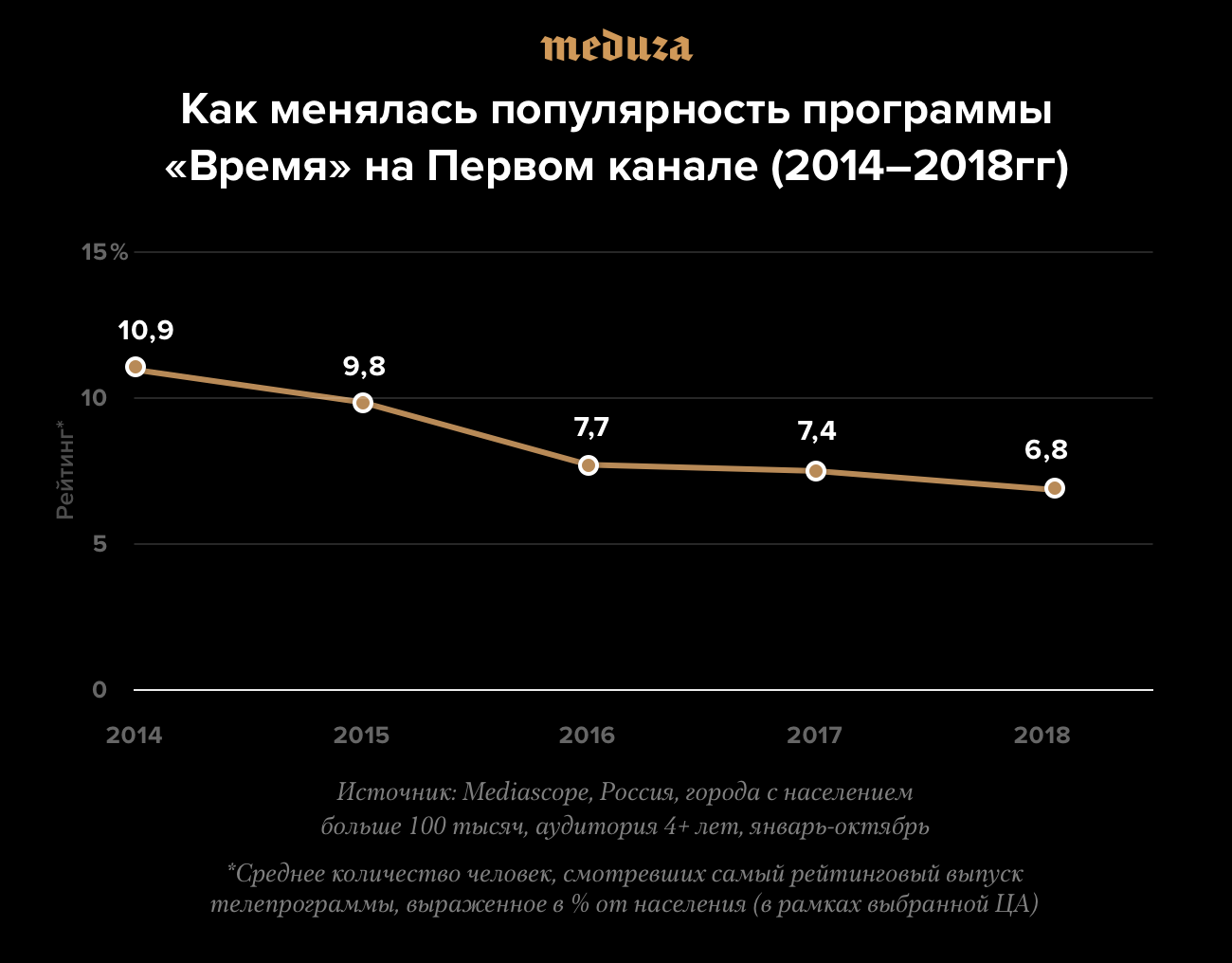 В среднем выпуск новостей на Первом в 2018 году смотрели 2,8 миллиона человек в городах с населением больше 100 тысяч человек, подсчитала компания Mediascope по просьбе «Медузы». Для сравнения: в ноябре 2019-го у сайта РБК было 2,6 миллиона заходов (данные Similarweb.com). А дневная аудитория «Яндекс.Новостей» — 7 миллионов человек (данные «Яндекс.Радара»).