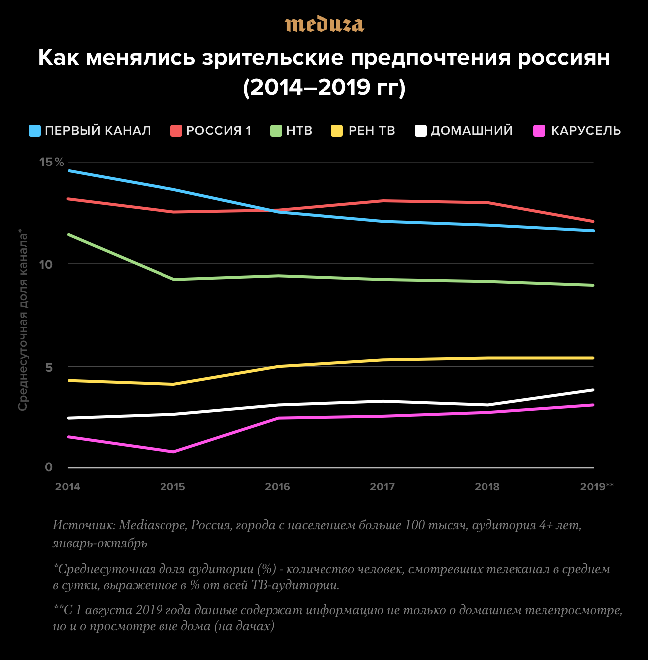 Вдобавок ко всему российское телевидение уже несколько лет переходит на цифровое вещание. В этом году в России запустили второй мультиплекс из десяти развлекательных каналов — они теперь доступны по всей России, даже там, где раньше показывали только Первый канал и ВГТРК. «Цифровое вещание — это разрушающая история для Первого канала, — говорит собеседник «Медузы», близкий к администрации президента. — Раньше по всей стране на огромном количестве территорий только один-два канала и принимали. При такой структуре было понятно, что Первый канал — стратегический вопрос. Сейчас у нас 20 федеральных каналов по всей стране, и Первый теряет и долю, и значимость».