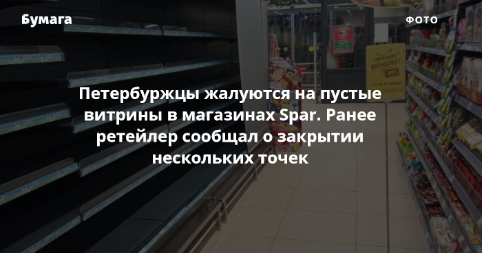 В середине декабря жители Петербурга пожаловались на пустые витрины в нескольких магазинах Spar. Фотографии очевидцев опубликовало издание «Форпост Северо-Запад».