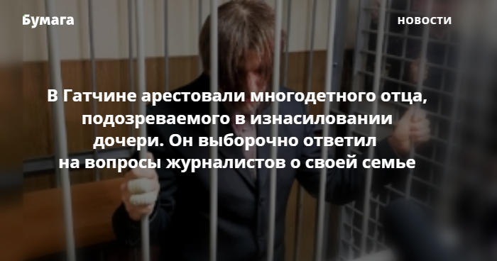 Гатчинский городской суд арестовал 46-летнего многодетного отца Андрея Бовта, которого подозревают в изнасиловании 13-летней дочери и незаконном обороте оружия. Об этом сообщается на сайте СК Ленобласти.