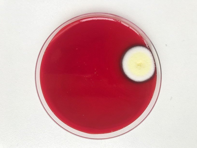 Но даже при таком делении на две зоны невозможно создать абсолютнейшую стерильность в зоне приготовления питательных сред. У нас нет такого тамбура, как показывают в кино, где бы специальный воздух со всех сторон обдувал человека, или еще чего-либо столь же фантастического. Поэтому время от времени, несмотря на все принятые меры, на чашках со свеженькой средой появляются незваные гости. Как, например, этот красавчик на фотографии, которого я окрестила Яишенка. Яишенка, безусловно, тоже закончил свою жизнь в автоклаве.