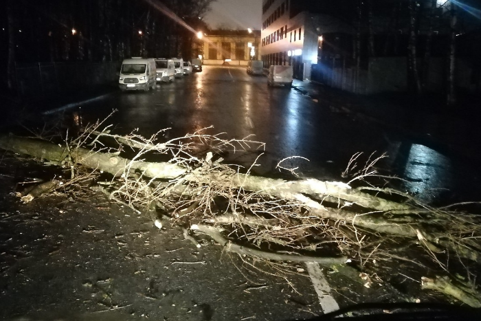 В ночь на 19 декабря в Петербурге был мощный шторм, дамбу закрывали из-за угрозы наводнения. Сильный ветер повалил деревья, дорожные знаки, светофоры и новогодние елки. «Бумага» показывает видео того, как это выглядело.