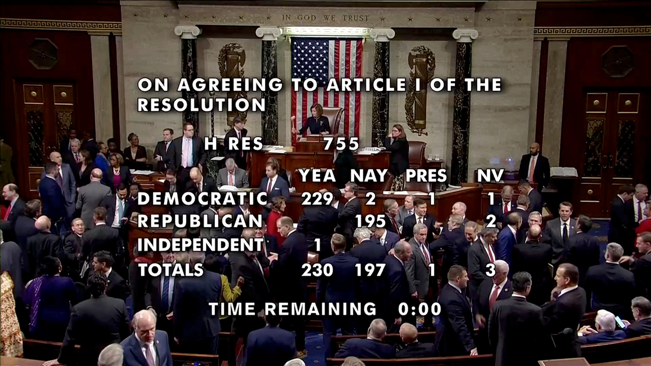 В результате за первую статью импичмента было подано 230 голосов, за вторую 229 при необходимом большинстве в 218 голосов.