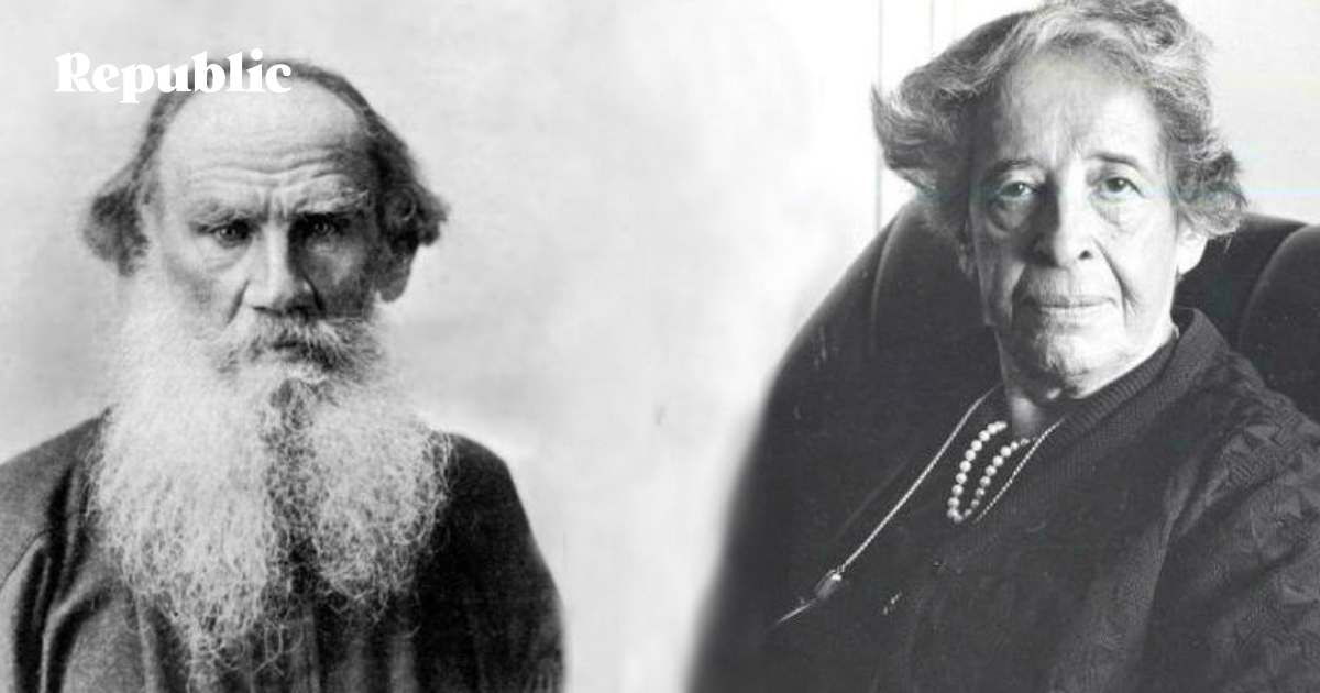 Герои статьи — Лев Толстой и Ханна Арендт — на первый взгляд обнаруживают больше различий, чем сходств. Их мысль лежит в слишком разных интеллектуальных областях, слишком мало пересекаются их исходные предпосылки. При всем этом они, каждый в своей эпохе, схожим образом ухватили суть противоречий между «разумностью», «моральностью» с одной стороны и жизнью человека в государстве и обществе с другой, хотя и подходили к этим вопросам с противоположных точек зрения: Толстой — c этико-религиозной, Арендт — с политической. Различие между этикой и политикой Арендт обозначила так: «Когда человеческое поведение рассматривается с точки зрения морали, все внимание сосредоточено на личности, а когда поведение рассматривается с точки зрения политики, внимание сосредоточено на мире». Из этих двух разных точек они двигались к страшной тоталитарной сердцевине XX века, упреждая модель «атомарного человека» Герберта Маркузе. Вскрыв внешнюю оболочку государственной брони, оба обнаружили за ней атомарную структуру, формирующую социальные массы. Если Толстой стоял на пороге открытия массового общества и массового человека, то Арендт уже наблюдала эти явления.