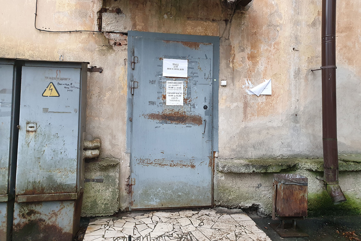 Выход, который все ищут сами, похоже, «инфицирован»: дверь снизу заржавела, штукатурка на осыпалась, из стен торчат металлические решетки и сыпется цементная крошка. На ступеньках снаружи с аппетитом обедает кошка. У пациентов же с питанием не сложилось.