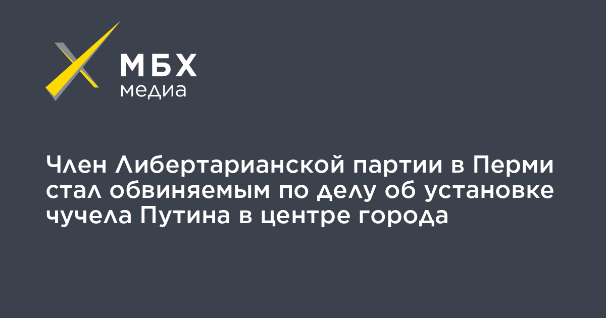 Член Либертарианской партии в Перми Александр Котов стал обвиняемым по уголовному делу о хулиганстве (часть 2 статьи 213 УК) из-за установки в центре города чучела с лицом Владимира Путина. Об этом Котов рассказал «МБХ медиа».