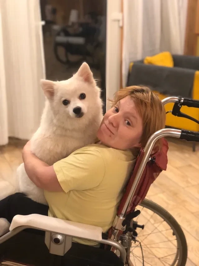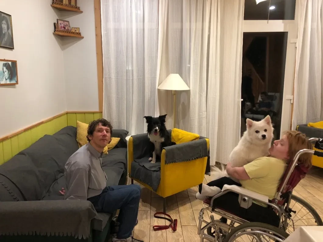 Зато неговорящего Колю, самого сложного из всех жителей дома, 20-летнего парня с множественными нарушениями, Молли отлично понимает без слов. Просто запрыгивает к нему на колени и, подсунув голову под руки, трется об них мордой, аккуратно щипает за рукава и замирает от прикосновений. Коля улыбается, раскачивается и повторяет несколько звуков. Юля переводит, что мы доставили ему очень много радости.