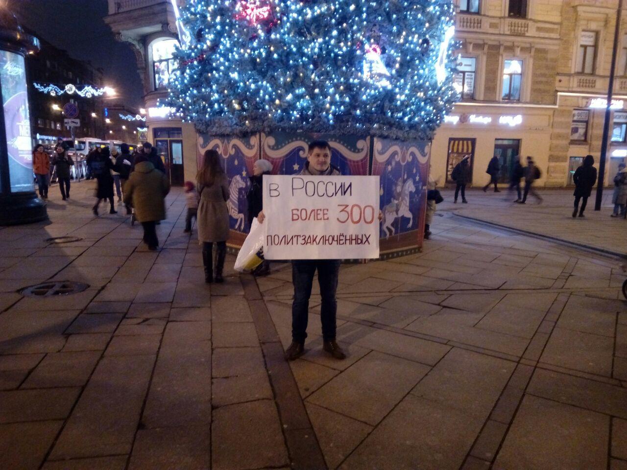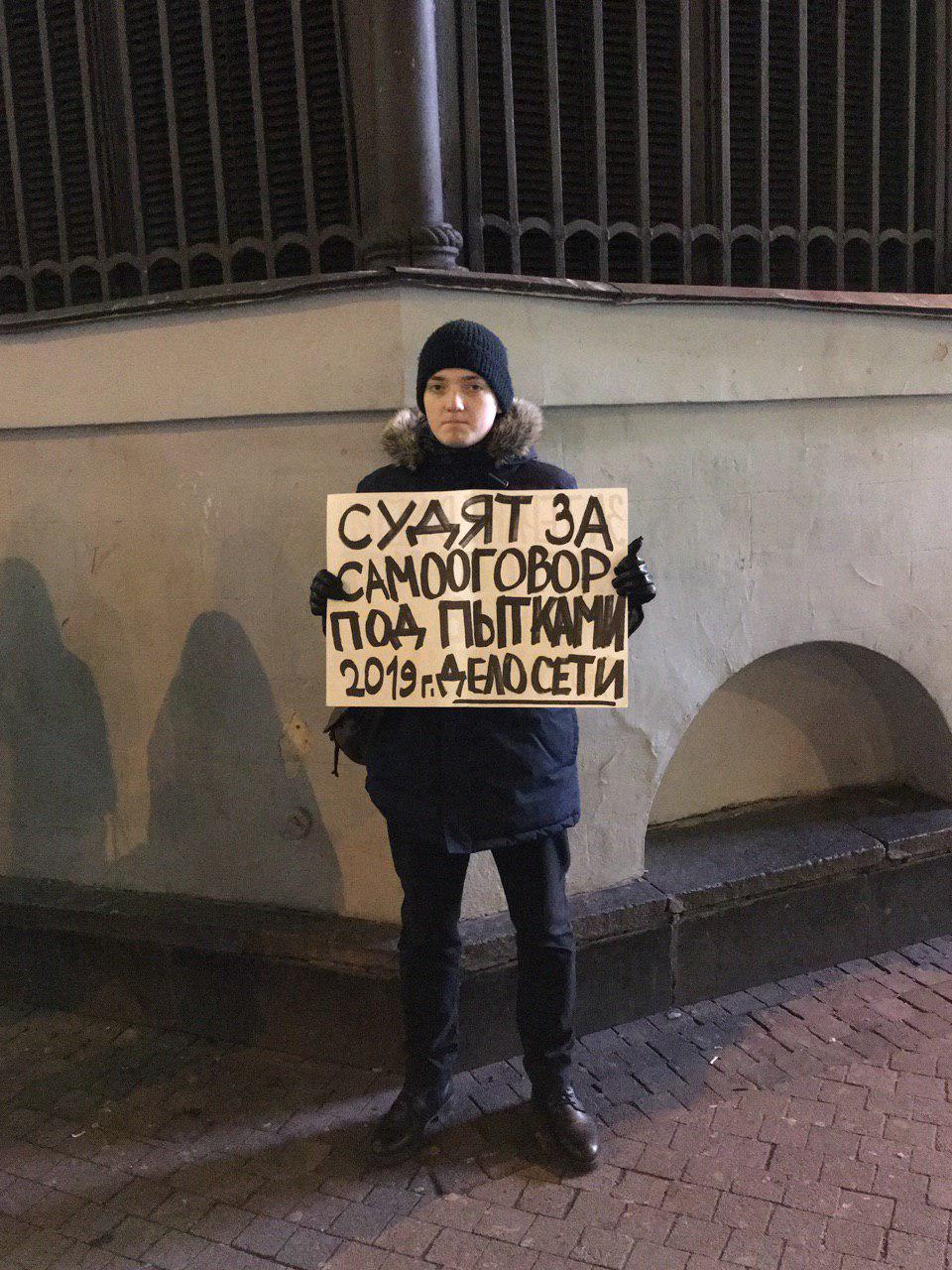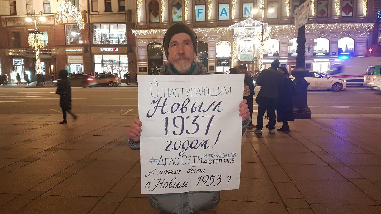 Отец обвиняемого по делу «Сети» Николай Бояршинов встал у Гостиного двора с плакатом «С наступающим новым 1937 годом». К тому же там стоят с плакатами «Моя Россия в тюрьме, в нищете и на погосте» и «Отпускай! Константин Котов». Депутат Борис Вишневский встал с плакатом «Свободу всем политзаключенным». Всего в акции участвует около 15 человек.