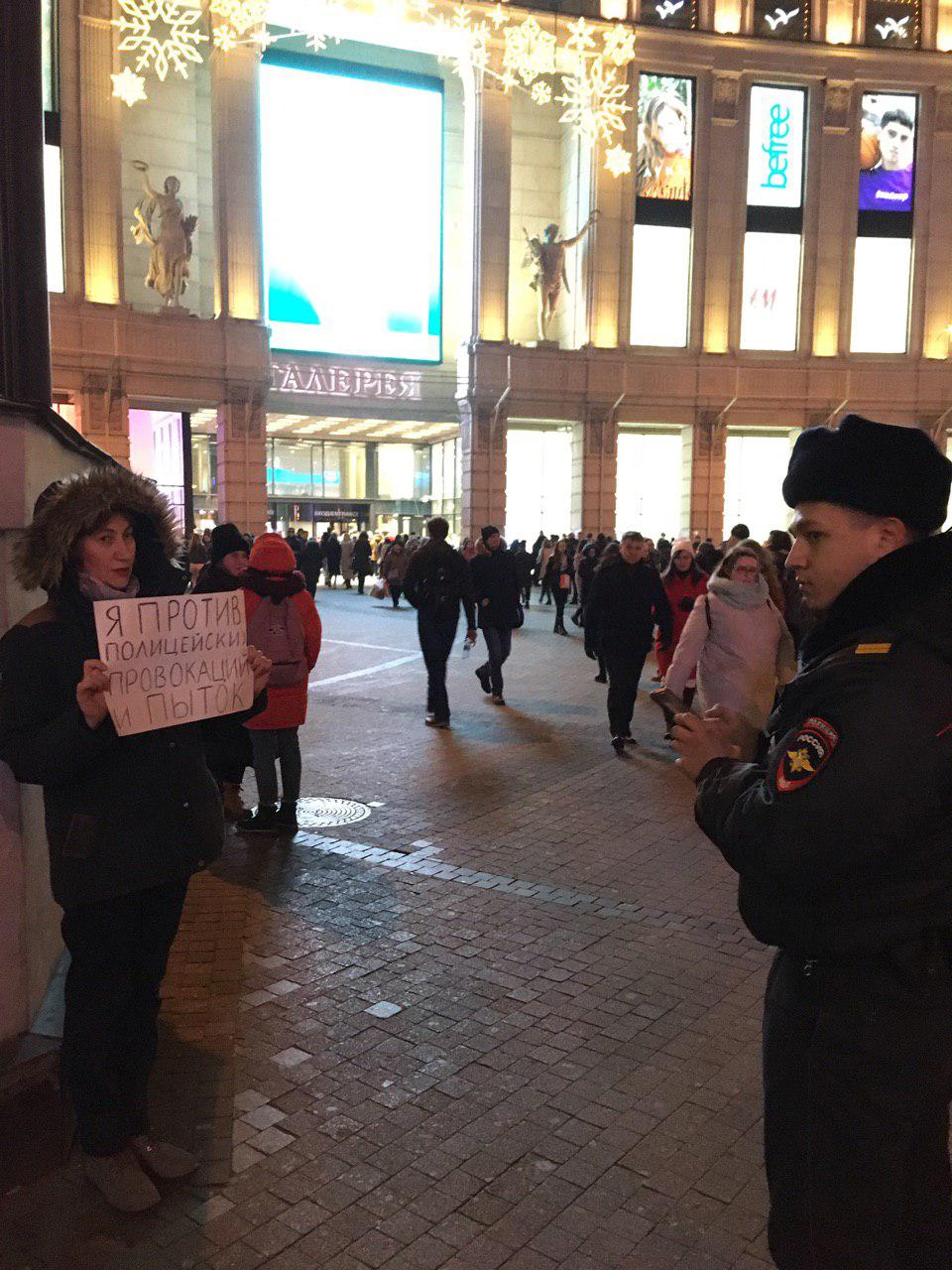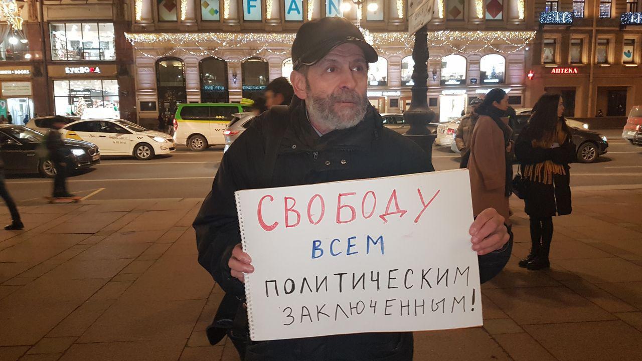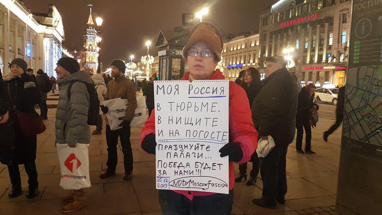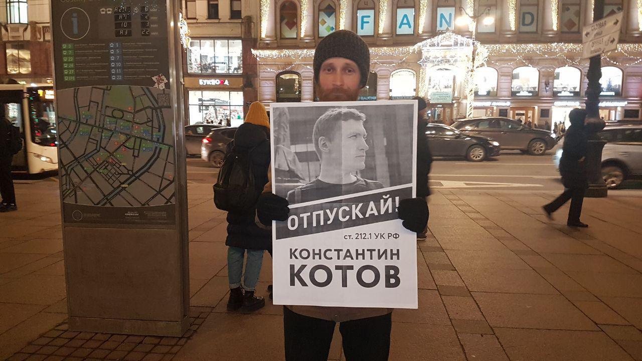 Отец обвиняемого по делу «Сети» Николай Бояршинов встал у Гостиного двора с плакатом «С наступающим новым 1937 годом». К тому же там стоят с плакатами «Моя Россия в тюрьме, в нищете и на погосте» и «Отпускай! Константин Котов». Депутат Борис Вишневский встал с плакатом «Свободу всем политзаключенным». Всего в акции участвует около 15 человек.