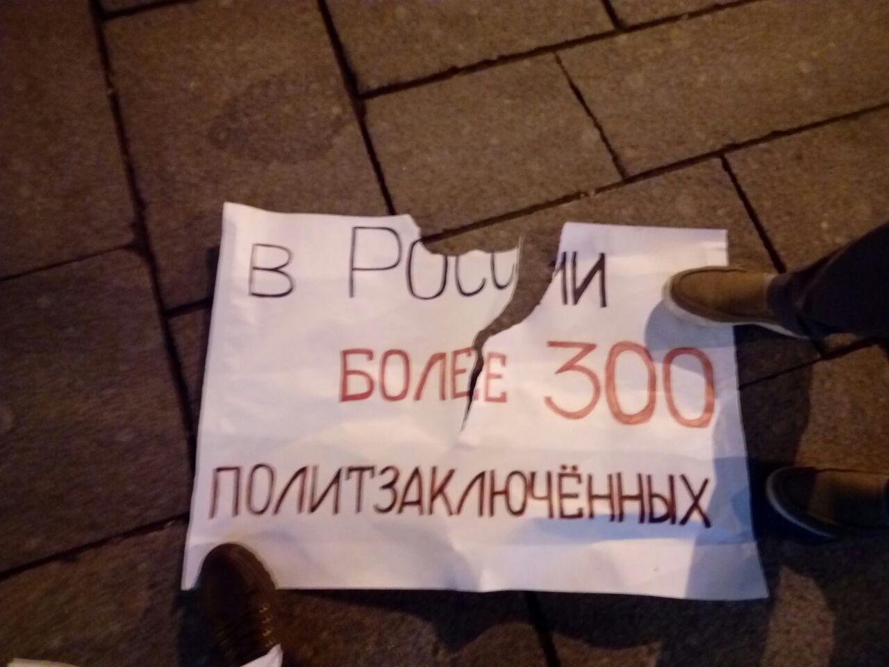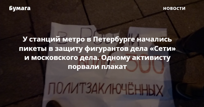 К «Василеостровской» вышел активист с плакатом «В России более 300 политзаключенных». Очевидцы сообщают, что прохожий попытался начать с ним драку и порвал плакат.