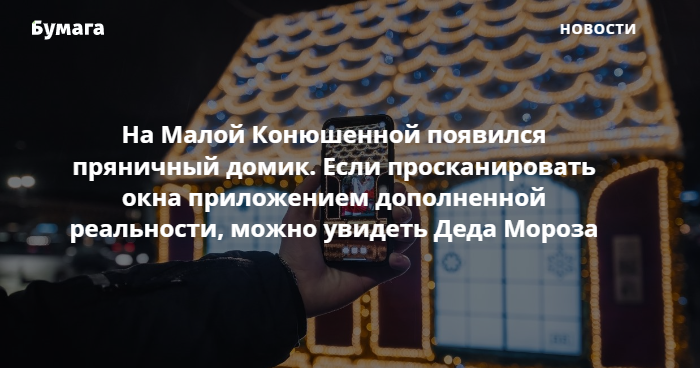 На Малой Конюшенной улице установили пряничный домик с технологией дополненной реальности (AR). Если просканировать его окна смартфоном со специальным приложением, на телефоне покажут сцены с Дедом Морозом. Об этом сообщила пресс-служба компании «Мегаполис», разрабатывавшая проект.