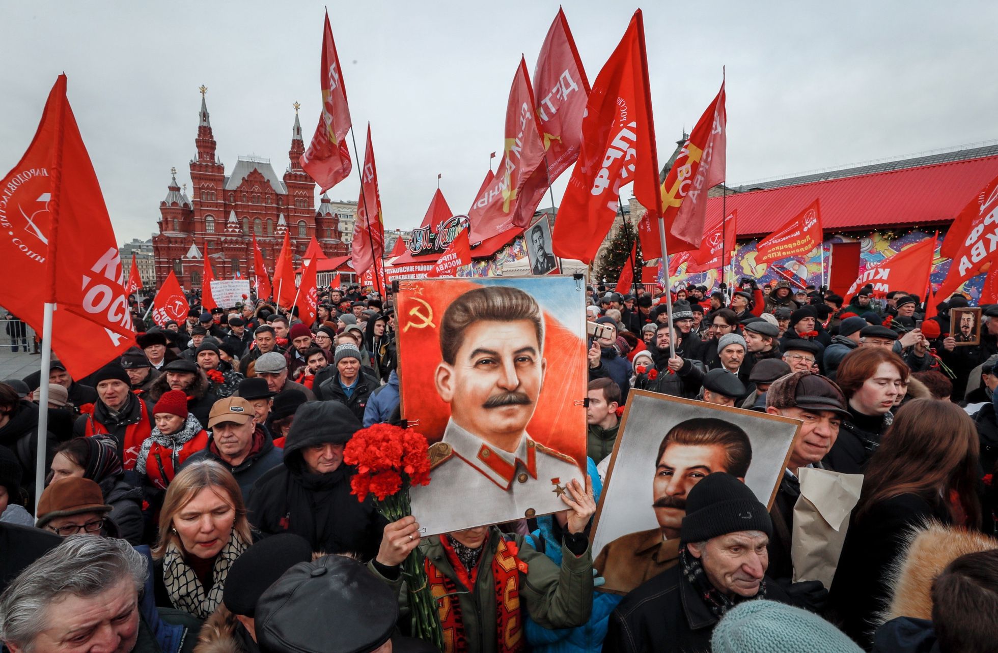 Юрий Кочетков / EPA / Scanpix / LETA Члены КПРФ и их сторонники собрались на Красной площади, чтобы возложить цветы к могиле руководителя СССР Иосифа Сталина, похороненного у кремлевской стены. 21 декабря 2019 года со дня рождения Сталина исполнилось 140 лет.