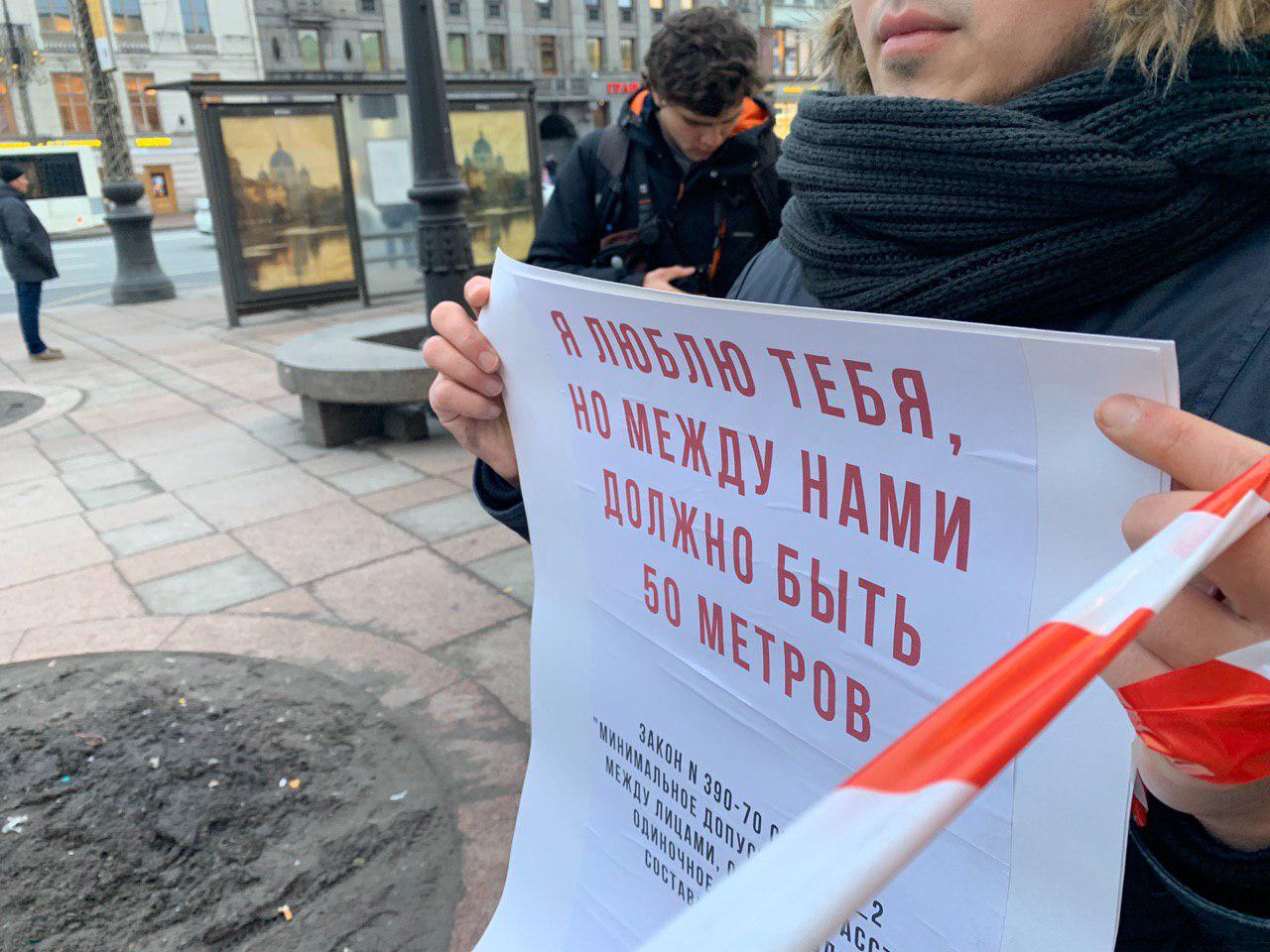 Активисты Алиса Кочелаева и Ян Кутин провели на Невском проспекте в Петербурге акцию "Я люблю тебя, но между нами должно быть 50 метров". Молодые люди требуют от местных властей сократить разрешенное расстояние между пикетирующими до 25 метров. Об этом сообщает корреспондент Север.Реалии.