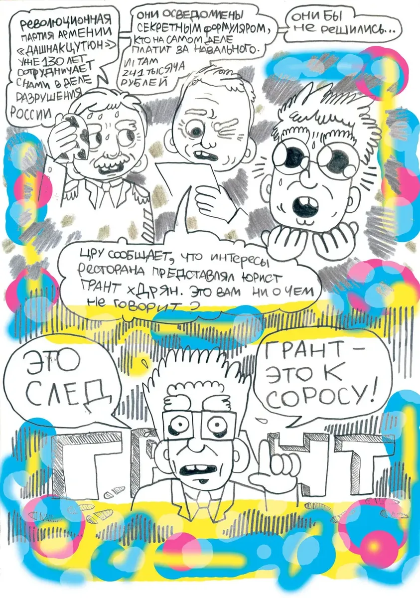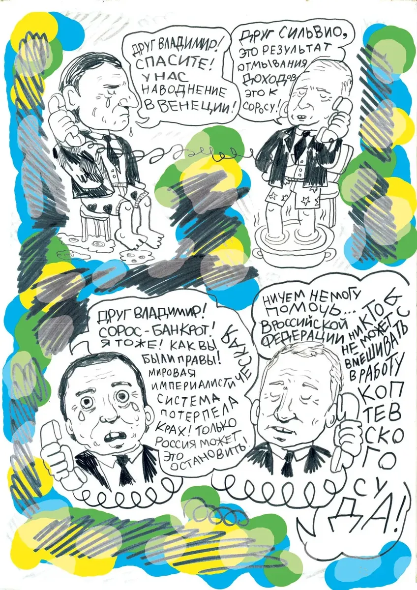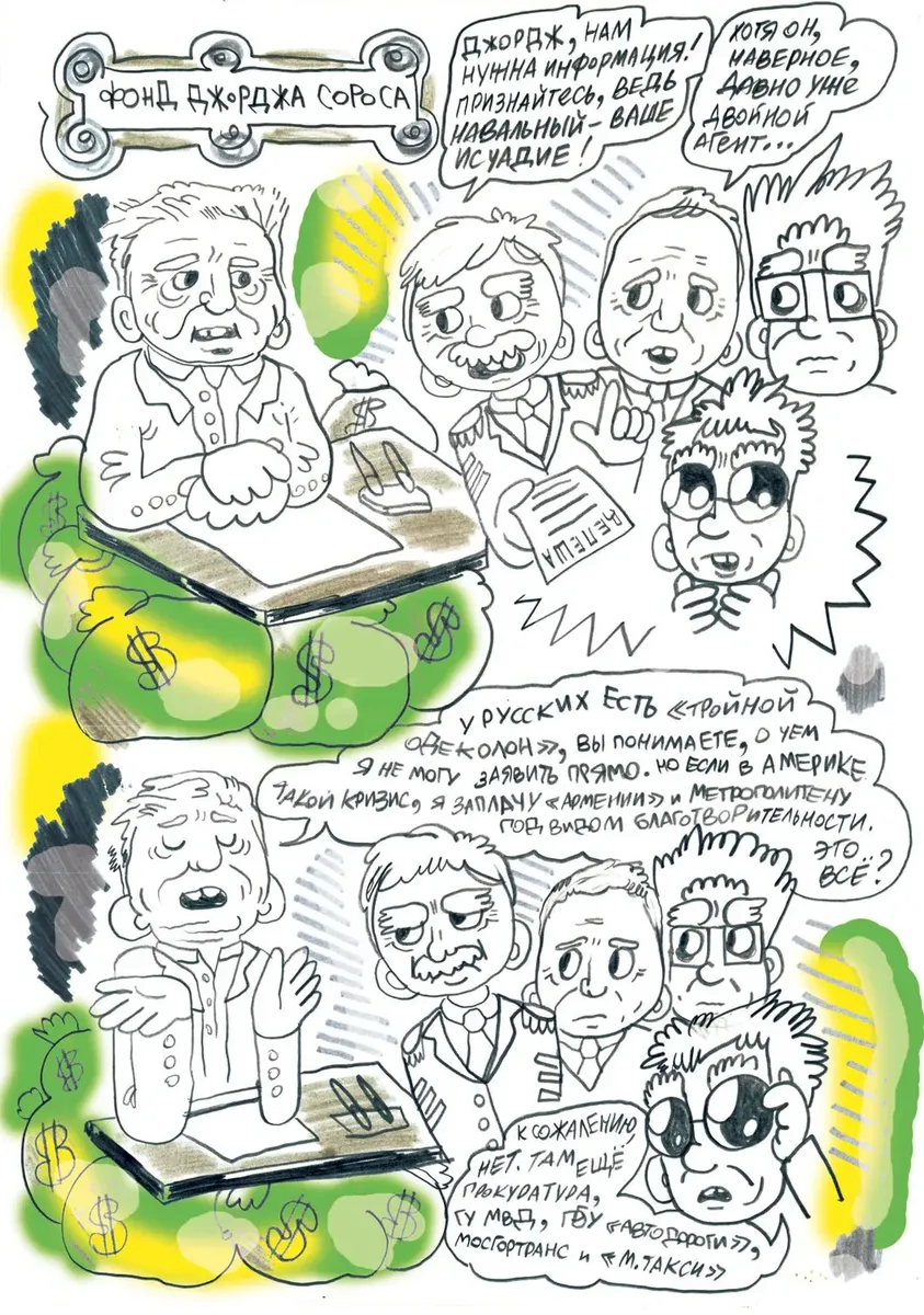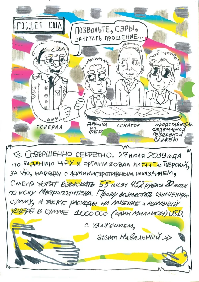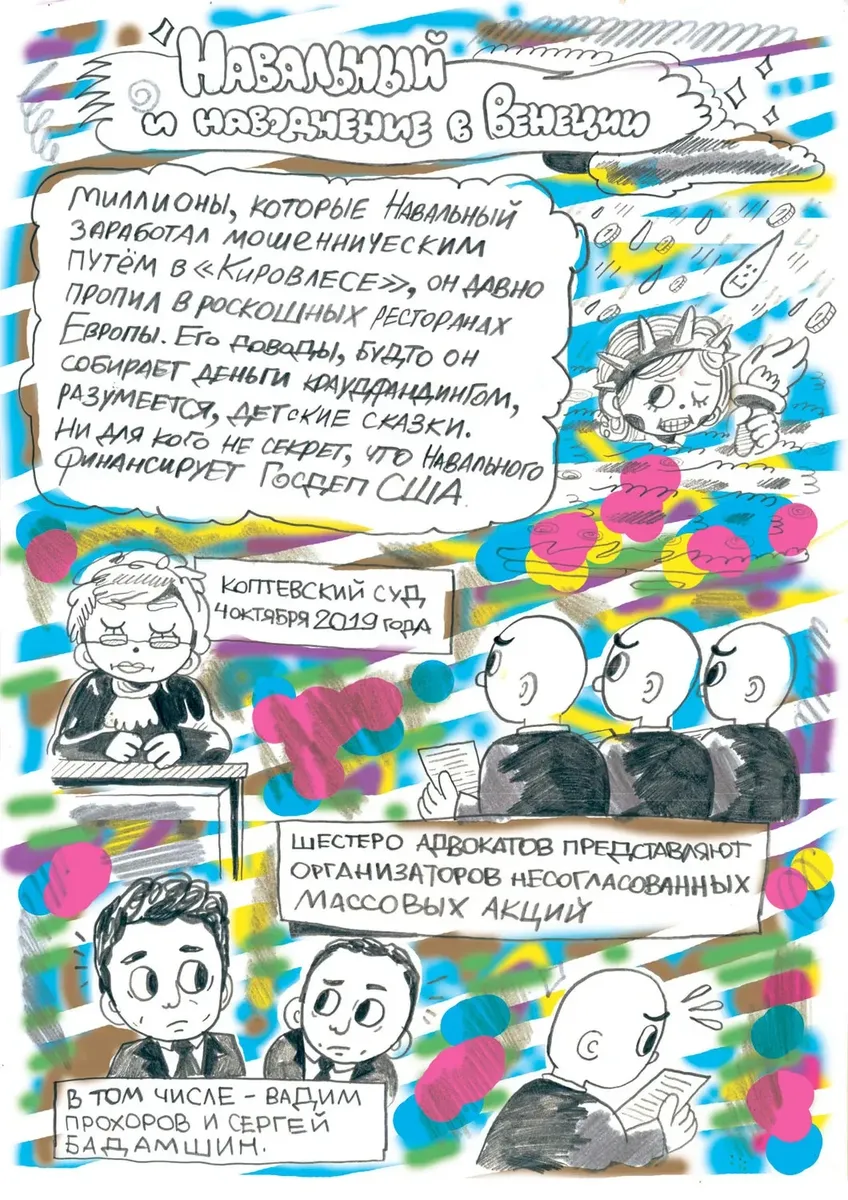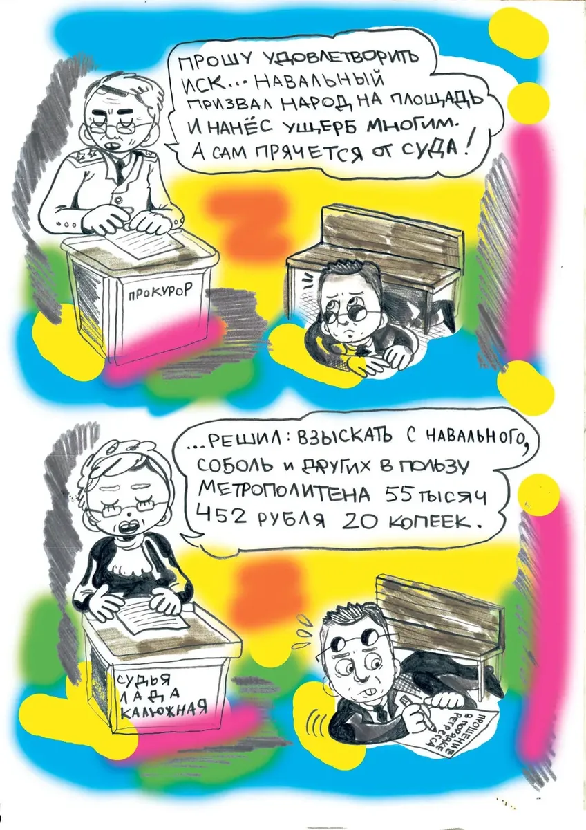 Комикс, конечно, про Коптевский суд. Но все же не только про него. Что такое абсурдные имущественные претензии, штампуемые московскими судами, что они означают? Они означают, что те, кто раньше сажал в тюрьмы и устраивал показательные процессы, поняли, что молодежь, которая выходит сейчас на митинги, этого не боится. Все акции власти предыдущих лет, начиная с 2011 года, были актами запугивания. А теперь это стало не страшно, это своего рода орден: какой же ты оппозиционер, если тебя не арестовали? Поэтому появилась новая технология.