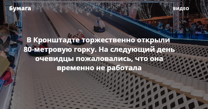 Днем 21 декабря в Кронштадте прошла торжественная церемония открытия 80-метровой горки, дно которой покрыто пластиком для надувных санок. На следующий день очевидцы пожаловались, что она не работает.