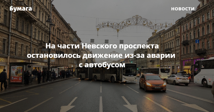 Примерно в 14:15 в воскресенье, 22 декабря, движение по Невскому проспекту в сторону площади Восстания остановилось из-за аварии с автобусом. Об этом сообщает корреспондентка «Бумаги».