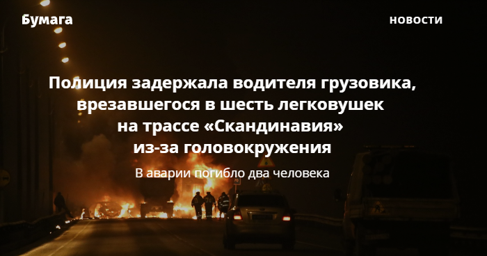 Полицейские задержали водителя грузовика, врезавшегося в шесть легковушек на трассе «Скандинавия». Его подозревают в нарушении правил дорожного движения, повлекшего по неосторожности смерть человека. По официальным данным, в результате ДТП погибло два водителя легковушек. Об этом сообщили в пресс-службе МВД.