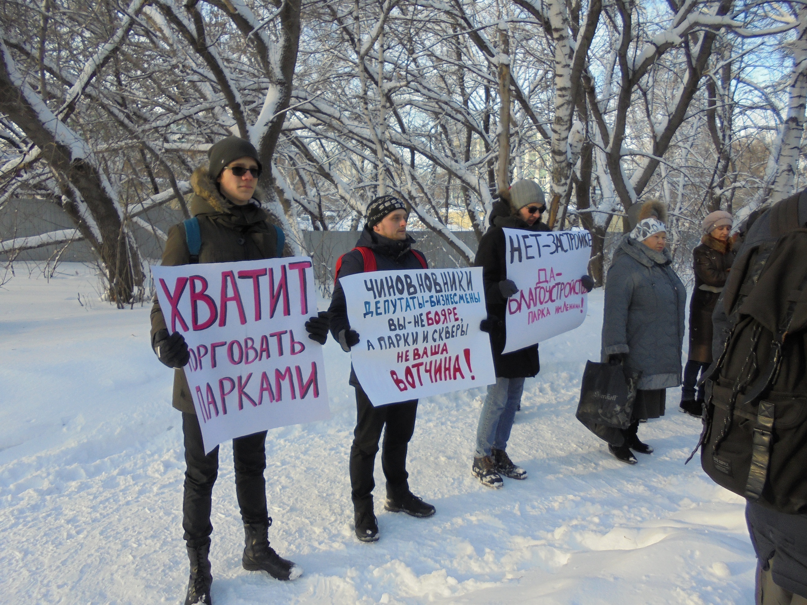 Выступавшие на митинге заявляли, что застройка зеленых зон Барнаула связана с обманом и коррупцией чиновников. "Поначалу чиновники администрации заявляют, что рядом с парком планируется построить спортивный комплекс, но в результате на месте появляются торговые центры и жилые комплексы. В этом парке также обещали построить спортивные сооружения, но вместо них мы видим два больших торговых заведения", – сообщила выступавшая Татьяна Труфанова.