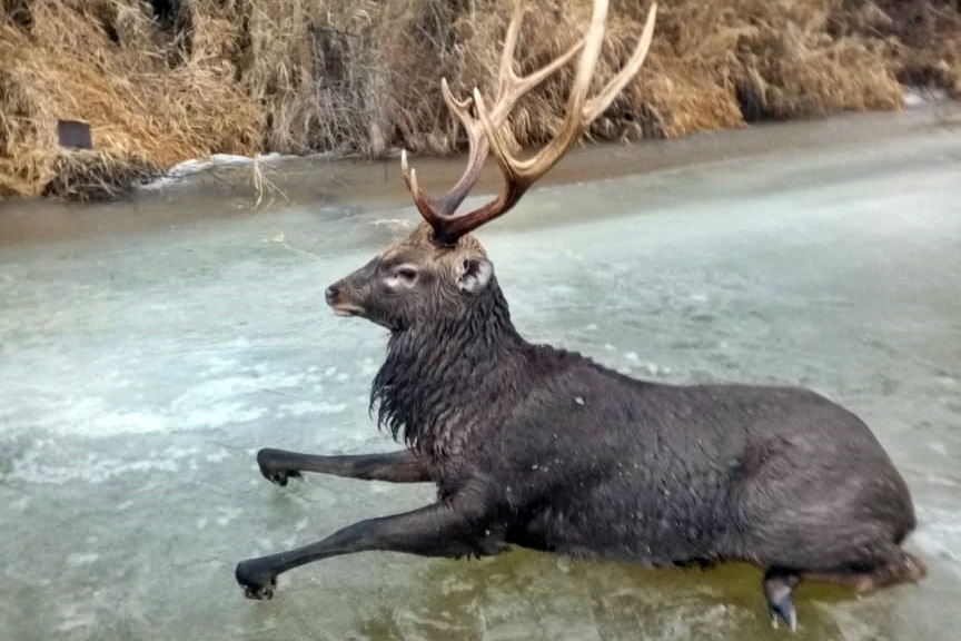 В Собинском районе пятнистый олень попал в полынью на реке Клязьма. Это произошло, когда он убегал от стаи собак.