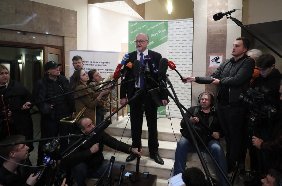 Глава РУСАДА Юрий Ганус дает пресс-конференцию. Фото: EPA