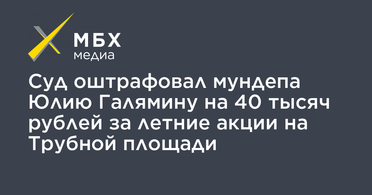 Мещанский суд Москвы оштрафовал на 40 тысяч рублей муниципального депутата Юлию Галямину за июльские акции на Трубной площади. Об этом «МБХ медиа» сообщил адвокат Михаил Бирюков.