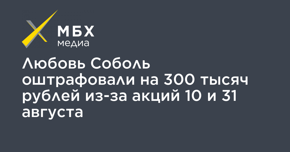 Соболь несколько раз штрафовали на 300 тысяч рублей по части 8 статьи 20.2 КоАП после летних акций протеста из-за недопуска независимых кандидатов на выборы депутатов Мосгордумы. Общая сумма штрафов для юриста ФБК превысила 1 млн рублей, протоколы на Соболь составляли из-за акций 15 июля на Трубной площади, 3 и 31 августа и других.