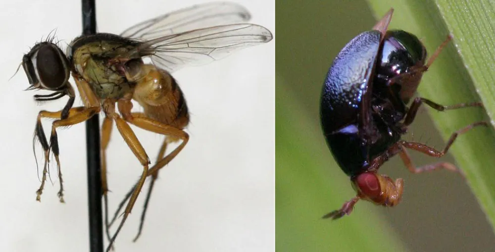 — С удовольствием. Новые виды показывать не буду, надо сначала опубликовать в научной статье. Но вот самец Atherigona pendleburyi с причудливо украшенными передними ногами. Вид описан американцем Мэллоком (John Russell Malloch) в 1935 году как раз по экземпляру с Fraser’s Hill. С тех пор его никто не видел, а теперь Зоомузей МГУ стал обладателем пяти самцов! Или синее существо, которое большинство приняли бы за жука. На самом деле это муха такая необычная — Spaniocelyphus palmi из тропического семейства Celyphidae.