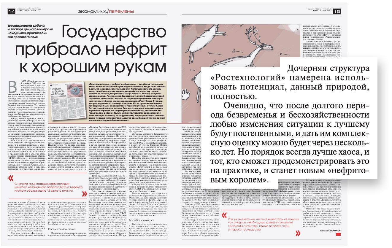 В 2014 году в газете, напротив, появилась публикация, в выгодном свете освещающая работу компаний Чемезова. Автором статьи «Государство прибрало нефрит к хорошим рукам» значится Алексей Баринов.
