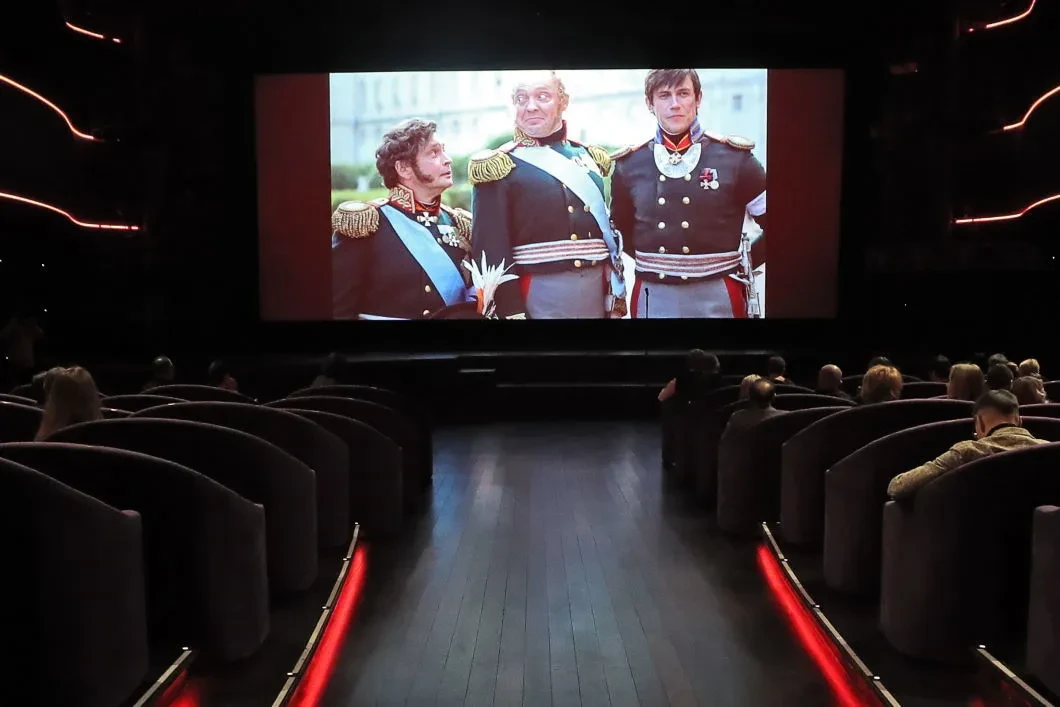 Масштабирование мегапроекта остро ощущалось уже на премьере, когда кинотеатр с революционным именем «Октябрь» был превращен в армейский бивуак постнаполеоновской эпохи, окружен и заселен гренадерами, драгунами, декольтированными барышнями. Барабаны отбивали построение и торжественный (не без давки) проход в фойе. «Вот прямо сейчас проходят учения по строевой подготовке! — захлебывался телекомментатор. — Взвод солдат и полковой оркестр показывают свое мастерство!»