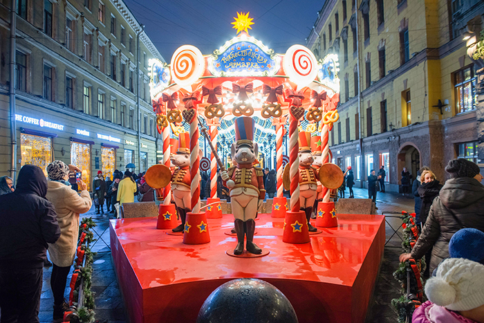 Главные герои ярмарки — это мыши, которые расставлены по всей территории. На Малой Садовой установлен подиум с мышиным оркестром, на Манежной они стоят у елок и скульптур сугробов. В елке также установлены несколько лайт-боксов, где силуэт мышки выглядывает, как будто она находится в домике. Без таких героев ярмарка была бы неживой. К сожалению, некоторые детали украшений люди забирают с собой — барабаны, которые висят на шее мышей, шары, за которыми, кстати, нужно тянуться.