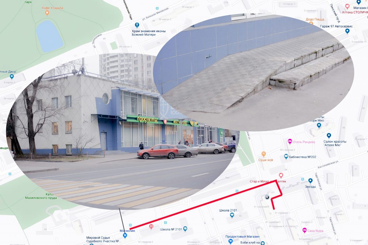 Маршрут от дома Александры до ближайшего магазина, в котором есть удобный пандусФото: Анна Иванцова для ТД Ныряют тоже с инструктором. Мы тогда поехали с мужем в медовый месяц в Анапу, и мне предложили там дайвинг. Могу сказать, что с парализованными ногами влезать в гидрокостюм — это очень весело. А еще ноги не тонут в воде, и инструктору пришлось меня топить. А потом он просто меня тащил за собой как котенка — без ласт же далеко не уплывешь. А [муж] Пашка рядом плавал, сам.