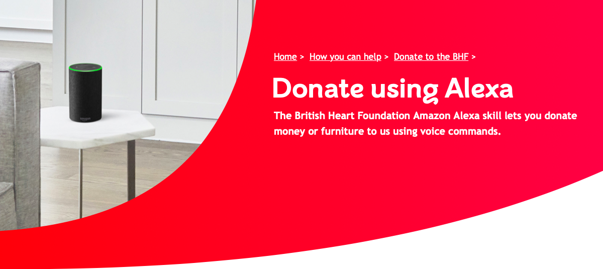 British Heart Foundation принимает пожертвования с помощью голосового помощника Alexa от компании Amazon. Пользователям достаточно сказать устройству: «Алекса, открой British Heart Foundation и пожертвуй деньги». Вводить реквизиты не нужно – устройство использует учетную запись Amazon Pay. Пожертвовать можно от £ 1 до £ 250. После перевода донор услышит запись с благодарностью от подопечного фонда. Еще один пример использования Amazon Alexa в благотворительных целях – фандрайзинговая викторина для организации Stand Up to Cancer.